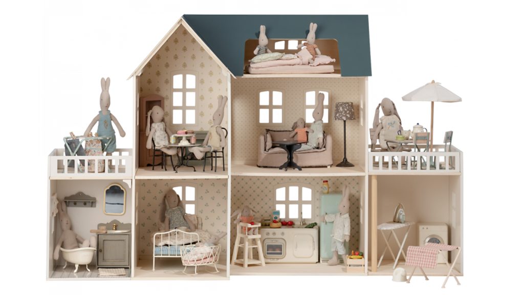 Das Puppenhaus des dänischen Herstellers Maileg ist ab sofort wieder erhältlich. In dem liebevoll gestalteten Miniatur-Zuhause finden kleine Häschen und Mäusche auf insgesamt drei Etagen jede Menge Platz, um ihren Alltag zu bestreiten. Das Häuschen selbst besteht aus Holz, ist im Vintage-Design gehalten und dank vieler Fenster lichtdurchflutet. Maileg setzt damit voll auf den Einrichtungstrend „Scandinavian Living“ – nur im Mikrokosmos. Es gilt, vier große Räume und einen Dachboden mit separat erhältlichem Zubehör wie verschiedenen Möbelstücken und natürlich den Bewohner selbst mit Leben zu füllen. Und sollte das Haus schließlich „zu voll“ sein, ist auch das kein Problem: Mit weiteren Anbauelementen lässt sich das Puppenhaus von Maileg nach links und rechts erweitern.