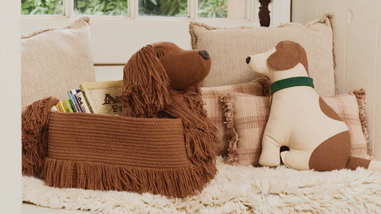 Ein besonderes Highlight sind die handgefertigten Baumwoll-Körbe und die formschönen Kissen. Diese sind in verschiedenen Größen und Hunderassen erhältlich und punkten mit verspielten Details. Das sind beim größten der Körbe, dem Golden Retriever, beispielsweise mit Stoff ausgekleidete Ohren, handverknotete Augen mit buschigen Augenbrauen, eine interaktive Schnauze mit ausrollbarer Zunge und ein beweglicher Mund. Natürlich bringen Körbchen und Kissen auch jeweils ihre eigenen Namen mit. Während Erstere wunderbar zur Aufbewahrung von Spielzeug oder als Wäschekorb genutzt werden können, haben die Kissen nur eine Funktion: kuscheln!