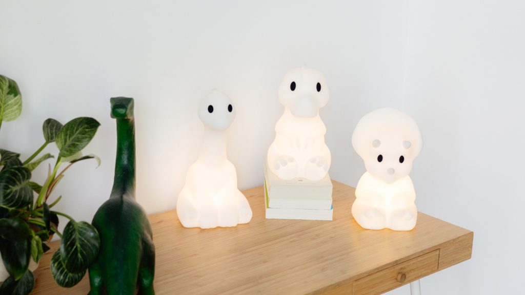 Angedacht sind die „First Lights“ vor allem für den Einsatz als Nachtlichter. Jedes verfügt über 6 Dimm-Modi, welche die aufladbare LED im Inneren unterschiedlich kraftvoll erstrahlen lässt. Je nach Einstellung hält der Akku bis zu 120 Stunden. Das wortwörtliche „Highlight“ ist allerdings weniger die LED-Lampe im Inneren, als viel mehr das süße Design der Silikon-Hülle. Während diese bis dato nur in Form eines (Eis-)Bären, Hündchens oder Häschens verfügbar war, bringt die jüngste Erweiterung der Kollektion auch „exotischere“ Tiere aufs Feld – und sogar urzeitliche! Den Dinosauriern widmet Mr Maria sogar eine ganze Mini-Serie: Triceratops „Mira“, Brachiosaurus „Nova“ und Allosaurus „Rena“ sorgen für eine erholsame Nacht.