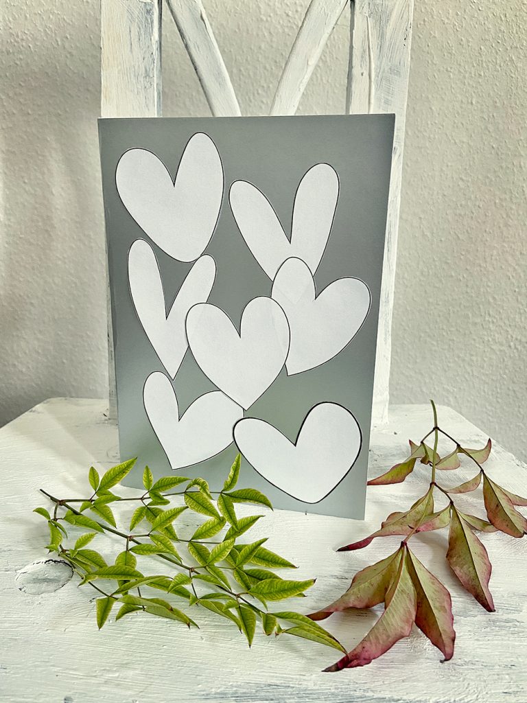 - Herzen über der Grußkarte verteilt mit einem Klebestift befestigen.