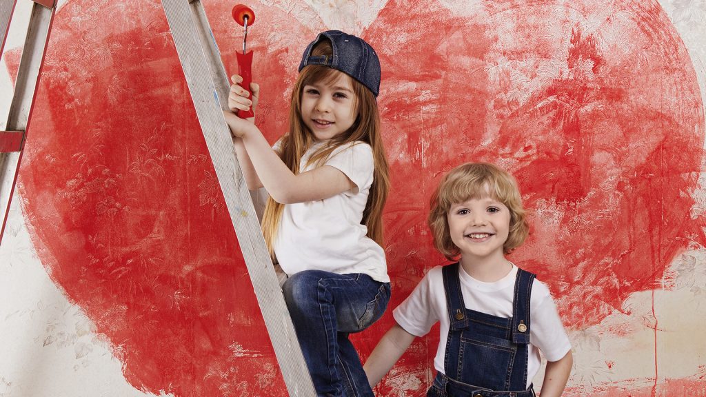 boy and a girl in jeans and a white T-shirt, with a paintbrush and a bucket stand on a ladder paint the wall in red, a big heart
