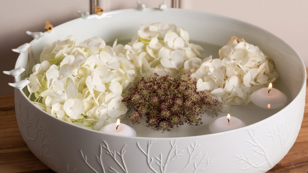 Mit einem Durchmesser von knapp 35,5 cm ist die Schale „Vogelschwarm“ vor allem eines: imposant. Sie bietet mehr als genug Platz für alle Arten von Dekoration, wobei sich insbesondere Blumen und Kerzen elegant drapieren lassen. Der Stil der Schale wird dabei nicht nur durch die schwungvolle runde Erscheinung gefestigt, sondern vor allem durch den namensgebenden Vogelschwarm. Dieser hat es sich auf einer Seite der Schale gemütlich gemacht. Die platzierten 3D-Vögelchen bestehen zum Teil wie die Schale selbst aus hochwertigem Porzellan, zum Teil aber auch aus Echtgold. Der dezent eingesetzte Farbtouch verleiht der Schale das „gewisse Etwas“. Auch wir sind vom Design, für das räder mit dem „German Design Award 2023 Special“ prämiert wurde, hellauf begeistert!
