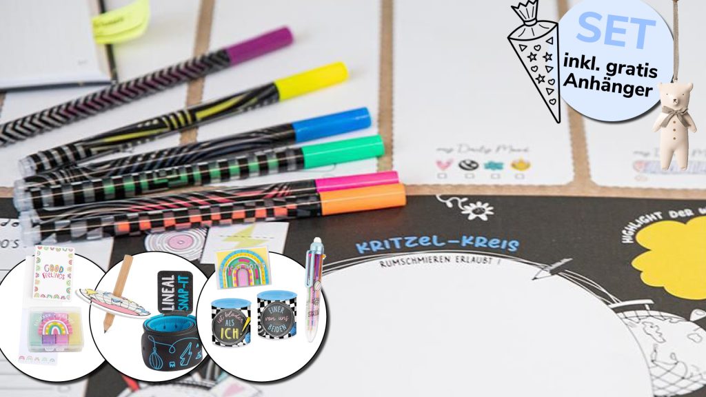 Mit unserem Set von leevje macht man garantiert nichts falsch. Dieses umfasst in beiden Varianten jeweils hochwertige Stundenpläne aus Holzschiffpappe sowie ein Hausaufgabenheftchen und stylische temporäre Tattoos. Während dem Set für Mädchen zusätzlich coole Muschel-Haarspangen beiliegen, freuen sich Jungs über eine Vielzahl von Dino-Stickern für ihre Schulhefte. Ein anderes Set von Trendhaus beinhaltet gleich mehrere unterschiedliche Stifte – neben bunten Gelpens enthält die Kombi auch einen Bleistift mit einem runden Radierer, wobei beides zusammen einen coolen Kreisel ergibt. Ein biegbares Lineal, das zeitgleich als Armband dient und so zum modischen Accessoire wird, sowie kleine Notizblöcke und Zettel, Anspitzer und Knet-Radierer runden das Paket ab. Absolute Blickfänge sind die jeweiligen Sprüche auf den Produkten.