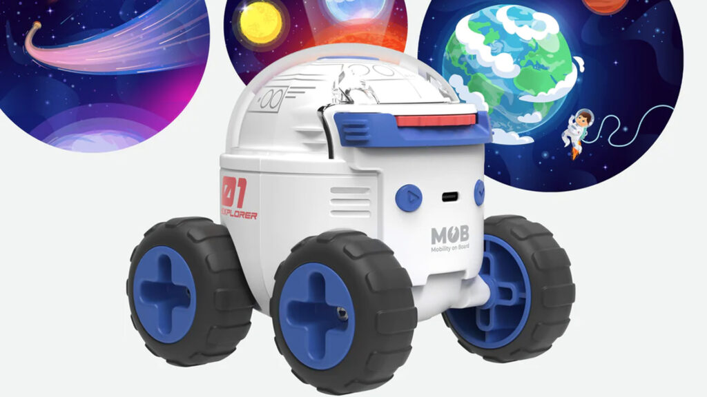 Die erste Neuheit aus dem Hause MOB ist der „Galaxy Light“ Lichtprojektor. Dieser verwandelt jeden Raum wortwörtlich in den Weltraum: Er projiziert in sieben verschiedenen Farbtönen Nebel und einen Sternenhimmel an die Wand. Die Lampe selbst ist per Fernbedienung um 180° drehbar und kann dank praktischer Timer-Funktion sogar als Nachtlicht eingesetzt werden. Über letzteres Feature freuen sich auch Nutzer des „Space Rovers“, der eine intergalaktische Dia-Show abliefert. 24 Dias mit unterschiedlichen Elementen des Universums bringen Kindern ebendieses näher. Ein beigelegtes Erklärbuch liefert zusätzliches Hintergrundwissen. Dazu ist der „Space Rover“, wie der Name bereits verrät, natürlich auch mobil: Er kann fahren!