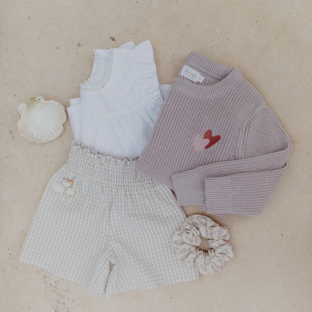 Dieser Strickpullover aus reiner Bio-Baumwolle hat einen klassischen Rundhalsausschnitt sowie gerippte Abschlüsse an Ärmeln und Saum. Das grobe Strickbild verleiht dem Jumper Struktur und ist ideal als leichte Schicht an kühleren Tagen. Die kleine Herzstickerei setzt einen feinen, liebevollen Akzent und fügt sich harmonisch ins Gesamtbild ein. Der Pullover lässt sich vielseitig kombinieren und passt zu Hosen, Röcken oder über Kleider.