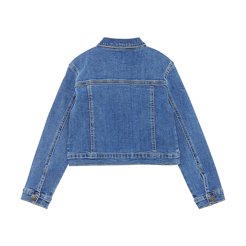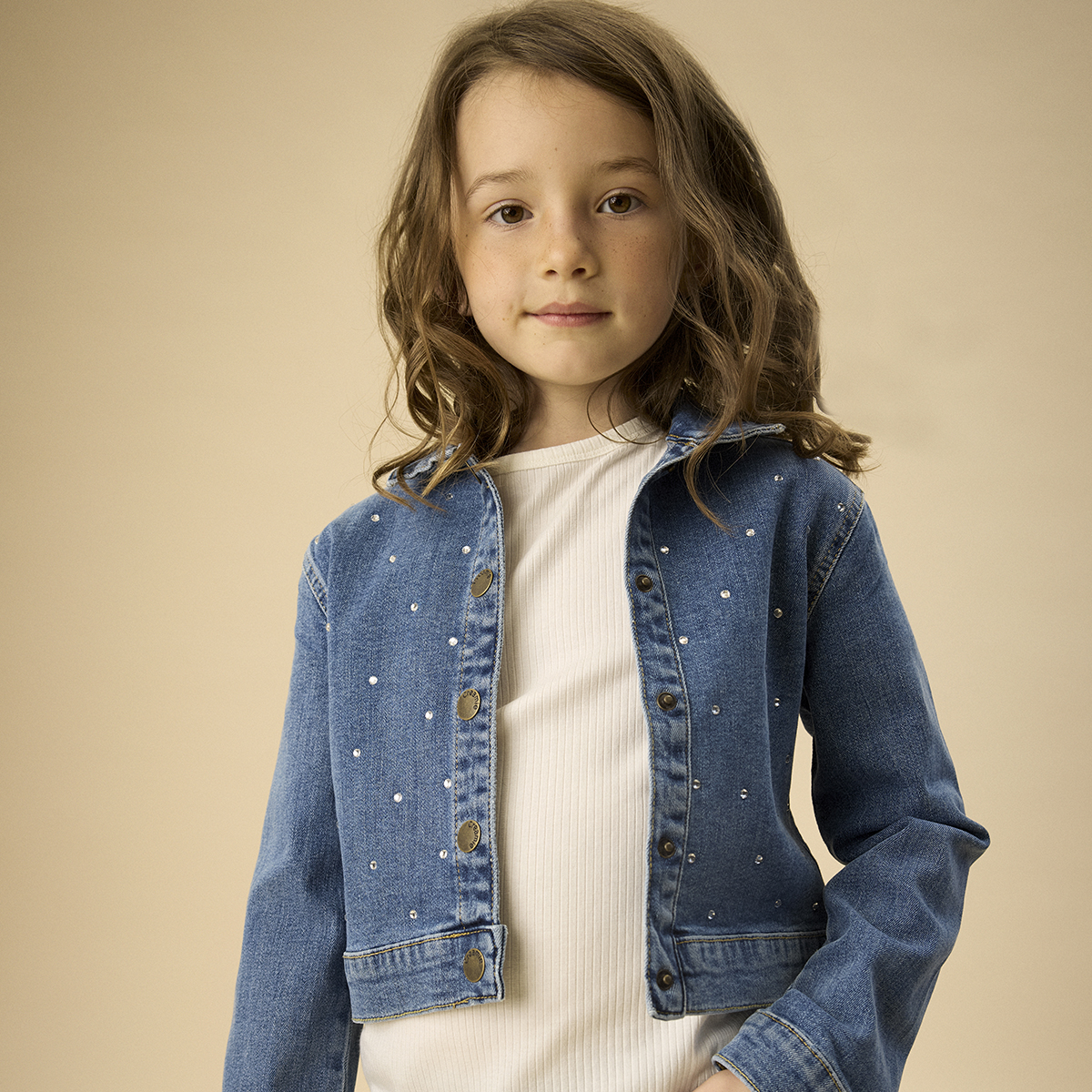 Blaue Jeansjacke mit Kragen von Creamie. Dieses Jacket ist vorne mit Strasssteinen besetzt, hat Cut&Sew auf der Rückseite und lässt sich vorne durch praktische Druckknöfe öffnen.
