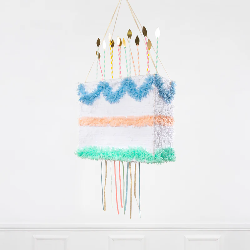 Zu einer richtigen Party gehört auf jeden Fall eine Pinata! Dieses Exemplar kommt in cooler Kuchen-Optik daher und schimmert mit ihren Papiergirlanden sowie Kerzen aus Goldfolie. Damit man die Pinata ohne Probleme mit Süßigkeiten befüllen kann, ist sie besonders einfach zusammenzubauen. Um während der Feier an den Inhalt zu kommen, kann man entweder an den Schleifen ziehen – oder die Pinata ganz klassisch „verdreschen“!