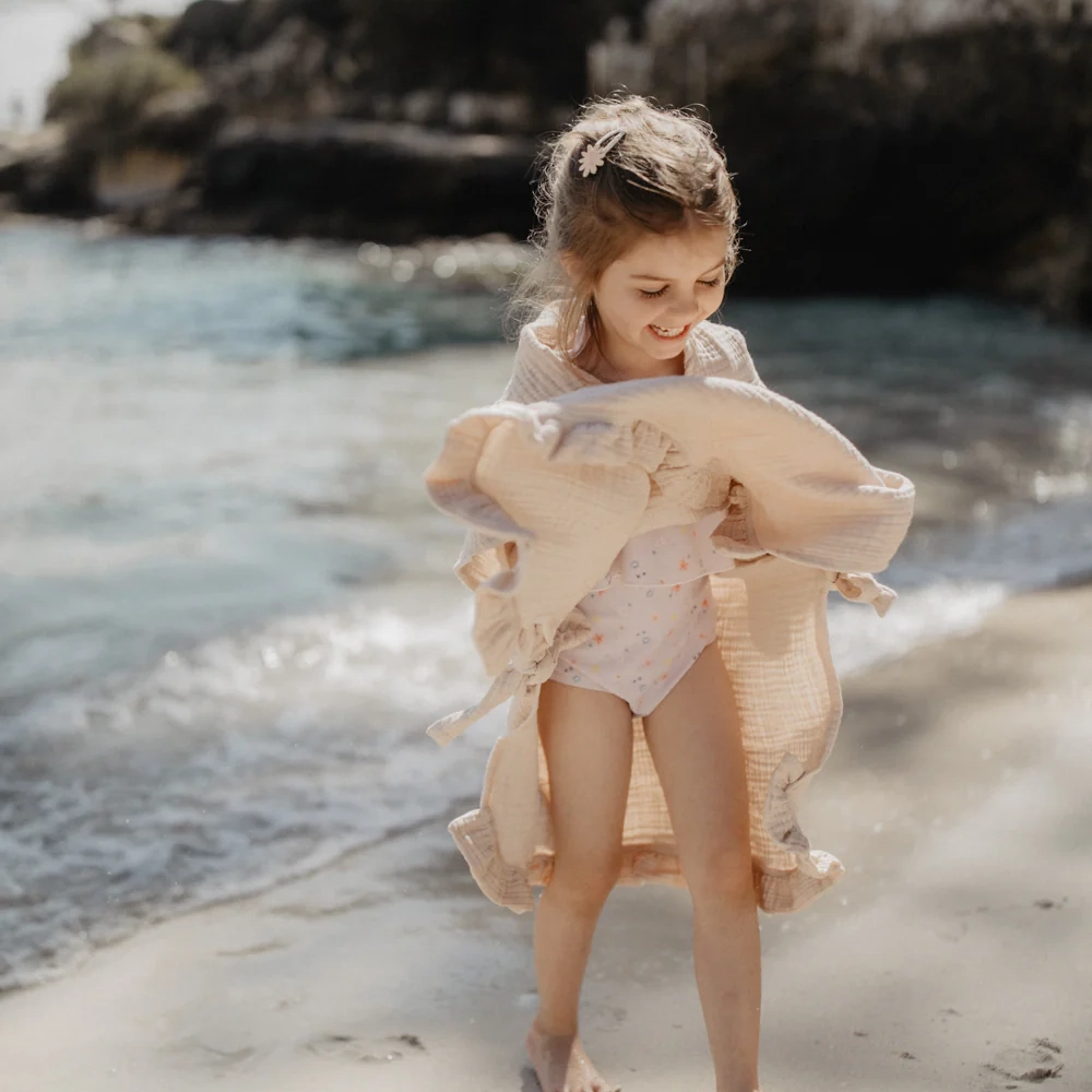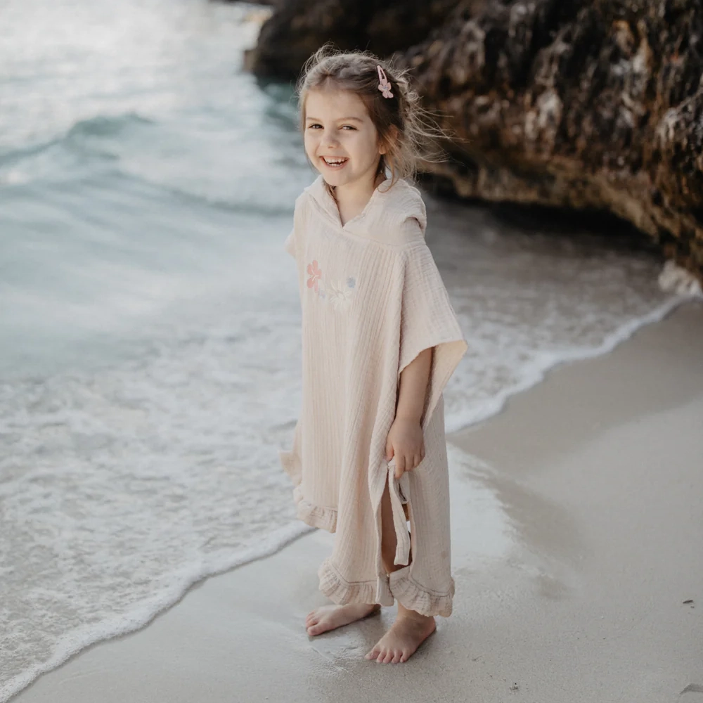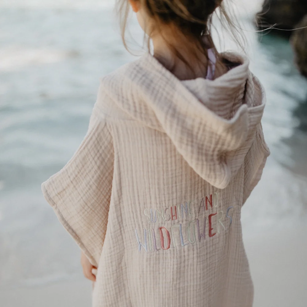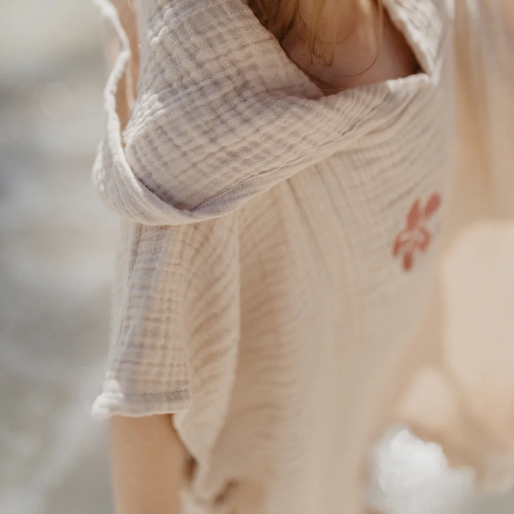 Dieser Poncho aus Musselin ist ein kuschelig-leichter Begleiter für nach dem Baden, am Strand oder zu Hause. Die hochwertige, vierlagige Musselin-Qualität aus Bio-Baumwolle fühlt sich besonders weich auf der Haut an und sorgt für ein angenehmes Tragegefühl. Eine Kapuze schützt vor Zugluft, während Bindebänder an beiden Seiten ein einfaches Selbstbinden ermöglichen. Liebevolle Stickereien auf Vorder- und Rückseite verleihen dem Poncho eine besondere, kindgerechte Note.