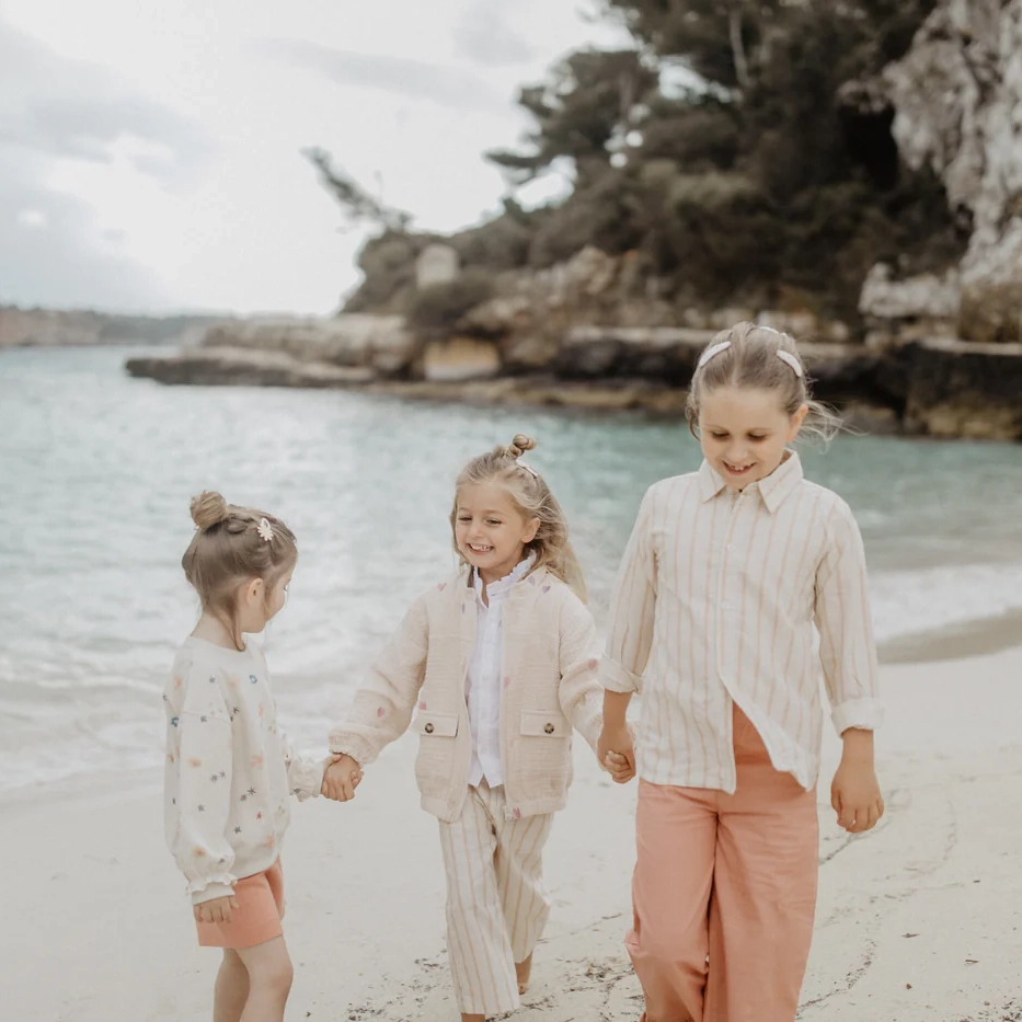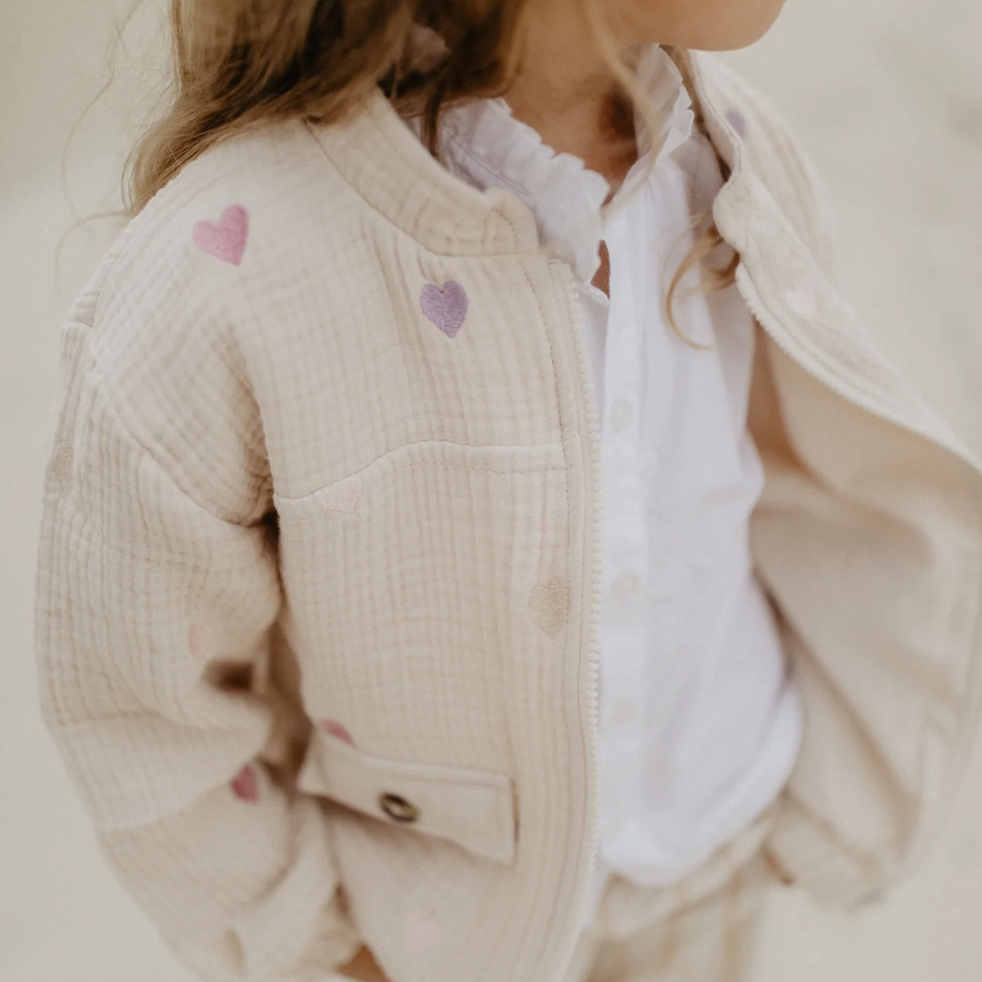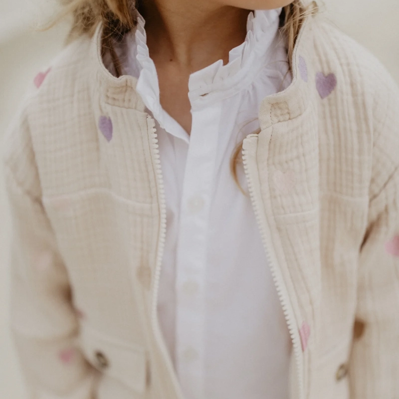 Diese leichte Jacke aus hochwertigem Bio-Baumwollmusselin verbindet sanfte Natürlichkeit mit liebevollen Details. Das vierlagige, fein gekräuselte Gewebe fühlt sich weich auf der Haut an und sorgt für ein angenehmes, ausgeglichenes Tragegefühl. Die dezent eingestickten Herzen setzen ruhige Farbakzente und verleihen der Jacke eine warme, kindgerechte Note.