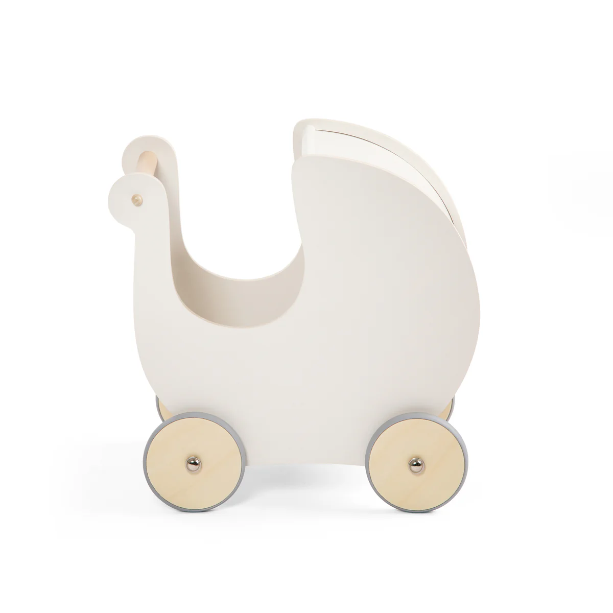 Wann immer Puppen oder Kuscheltiere sich an ihrem Stammplatz langweilen, kommt dieser schwungvolle Puppenwagen zum Einsatz. In dezentem Weiß gehalten, passt er zu so gut wie jeder räumlichen Umgebung. Die Gummiräder verhindern außerdem Lärm, wenn er über einen Holzboden gefahren wird.