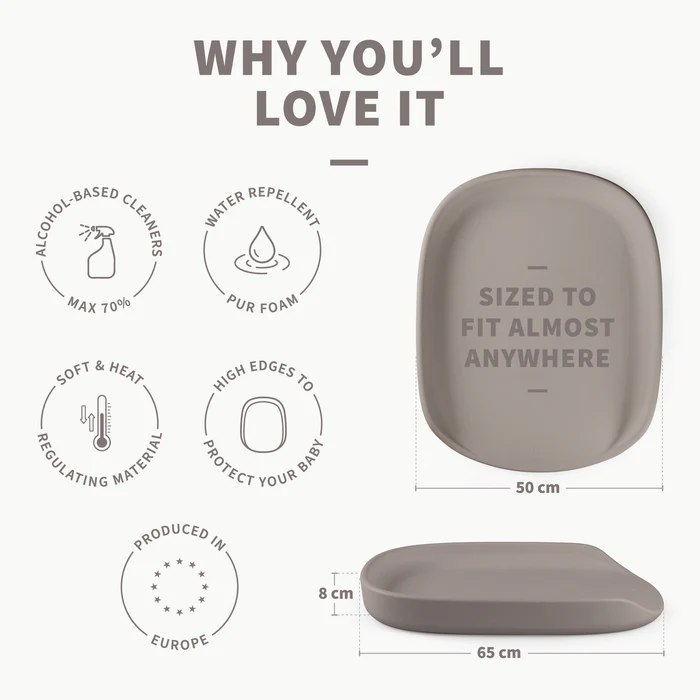 Diese Wickelmatte von sebra in der trendigen Farbe „Jetty beige“ verbindet minimalistisches Design mit hoher Funktionalität und sorgt für eine angenehme Wickelzeit. Die weiche, leicht erhöhte Form erinnert an ein Babynestchen und bietet Babys zusätzlichen Schutz und Geborgenheit. Dank der wasserabweisenden Oberfläche ist die Matte besonders pflegeleicht und lässt sich im Alltag schnell und unkompliziert reinigen. Gleichzeitig überzeugt das langlebige Material durch seine Strapazierfähigkeit – ideal für die tägliche Nutzung über einen langen Zeitraum hinweg.