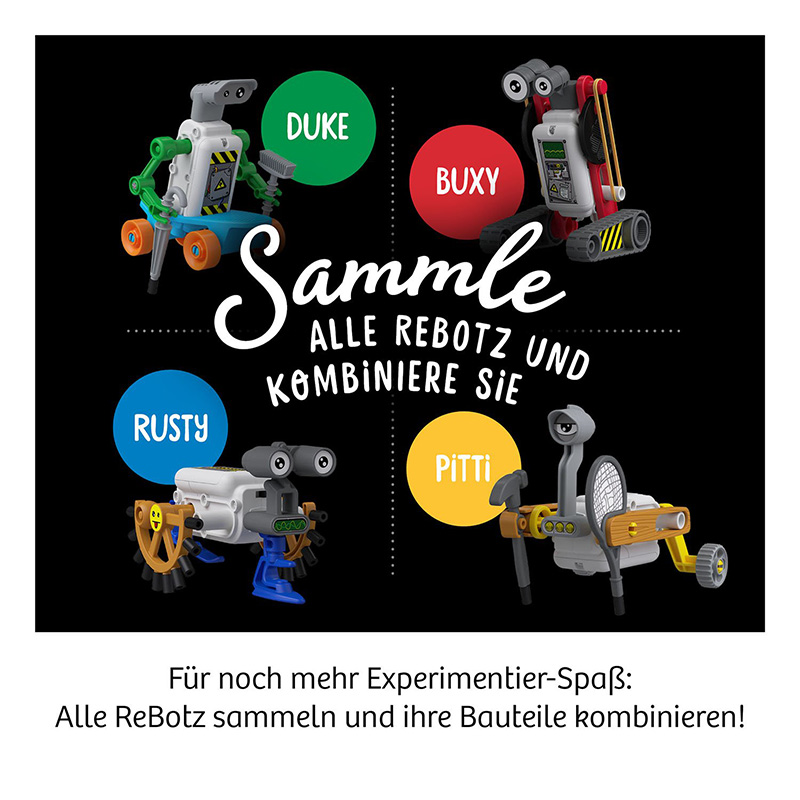 Die Roboter aus der ReBotz-Robo-Gang von KOSMOS springen, krabbeln, skaten, walken – und sorgen für jede Menge Spaß! Jeder Roboter hat dabei seine ganz eigene Spezial-Funktion – die sich wiederum mit denen anderer Robo-Gangmitglieder kombinieren lässt, denn die Körperteile der Schrottplatzbewohner sind untereinander austauschbar. So entsteht jede Menge verrückter Spaß, wenn man alle ReBotz-Robos sammelt!
