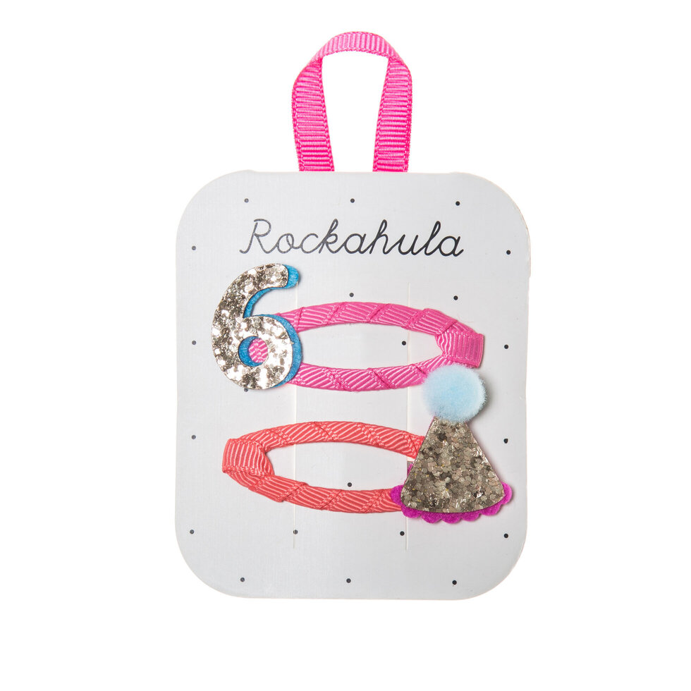 Mit diesem Haarspangen-Set von Rockahula, bestehend aus zwei mit Stoffband umwickelten Haarklammern, fallen die Kleinen an ihrem Ehrentag besonders modisch auf – und jeder weiß sofort, was gefeiert wird! An den Klammern ist jeweils eine Glitzerzahl befestigt, die das Outfit des Geburtstagskindes aufwertet.