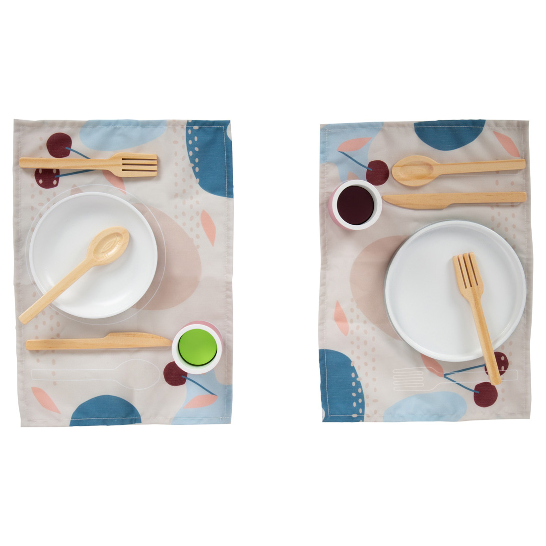 • bietet zusätzlichen Lerneffekt durch bedruckte Platz-/Tischsets, die zeigen, wie der Tisch richtig gedeckt wird