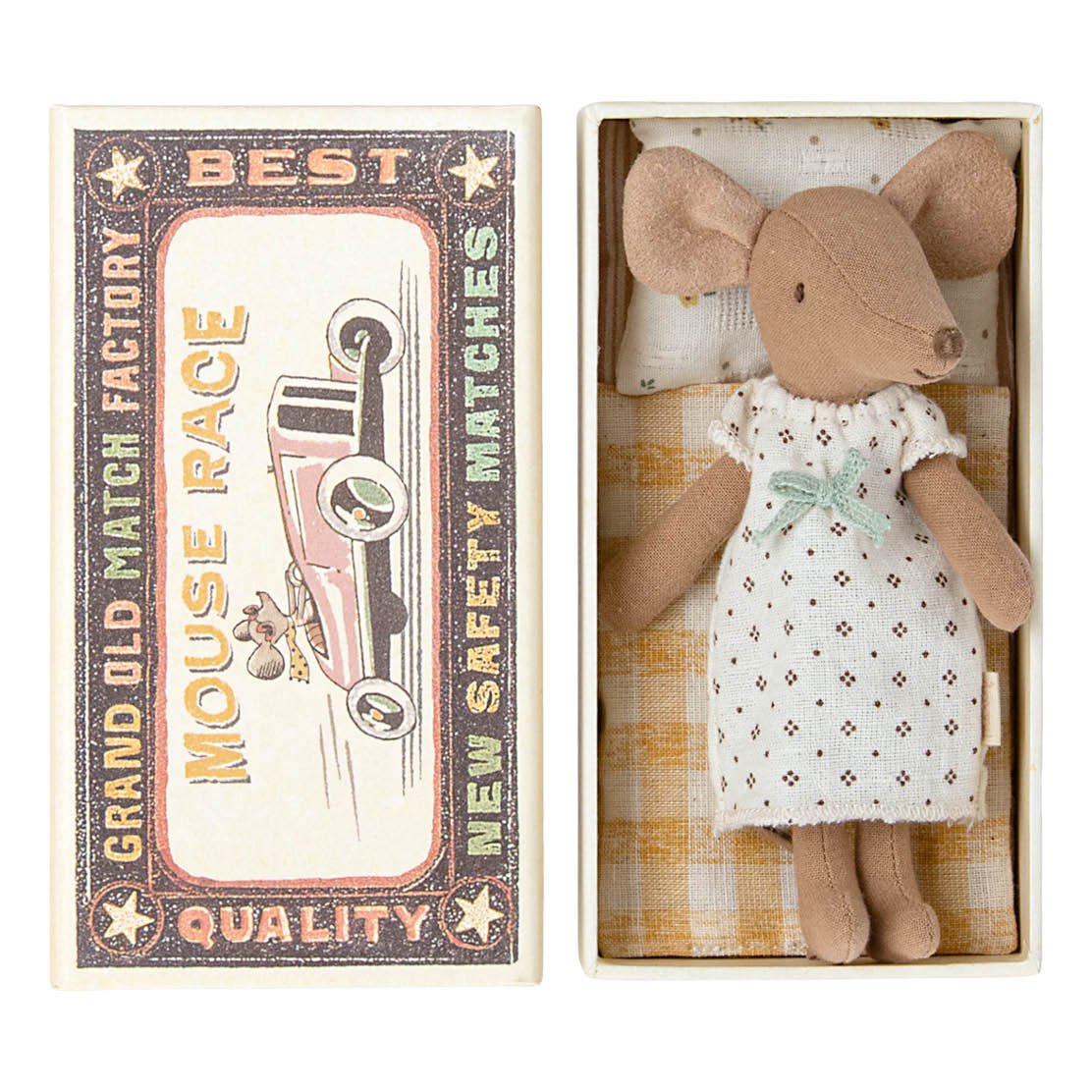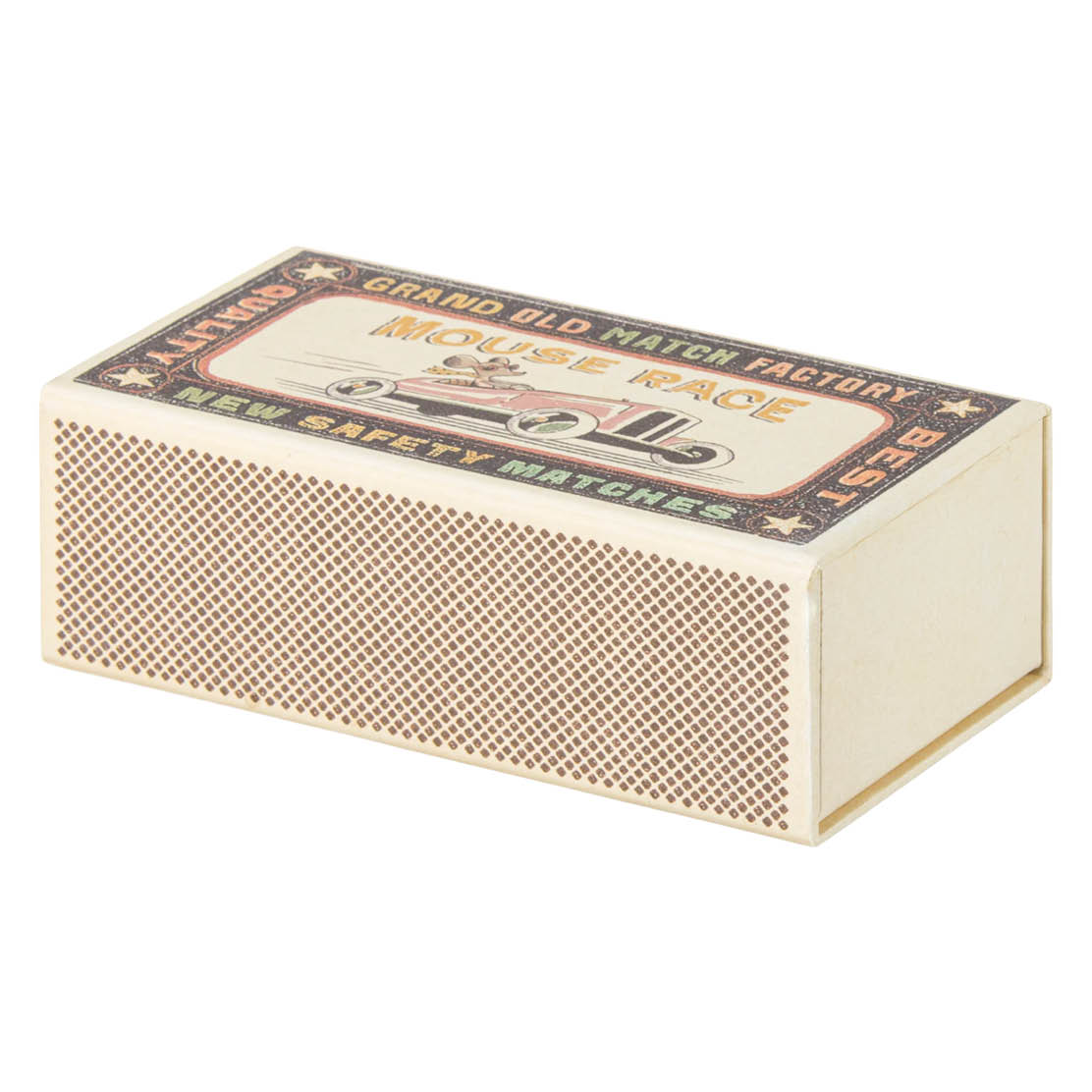 Dieses Familienmitglied der Matchbox-Mäuse-Familie von Maileg macht es sich nach dem Spielen gerne in einem kleinen Streichholz-Schächtelchen gemütlich. Dabei hat jede Maus natürlich ihren ganz eigenen Rückzugsort – Bruder und Schwester schlummern jeweils in einer Box mit Rennauto-Aufdruck. Maileg setzt bei der Produktion der Kuschelmäuse auf hochwertige Baumwolle, was wiederum für ein angenehmes Gefühl beim Spielen sorgt.