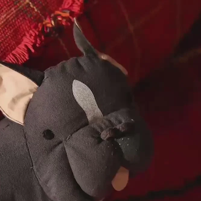 Dieses handgefertigte, lustige Kissen hat die Form eines echten Französischen Bulldoggen, gefertigt aus weichem Baumwollstoff mit hellgrauem Aufdruck. Es hat spitze Ohren, die nach oben stehen, eine herausgestreckte Zunge und eine markant geformte Nase aus Kordel – ganz wie ein echter Frenchie! Ein verspieltes und liebenswertes Kissen, das jedes Zimmer mit einem Lächeln erfüllt.