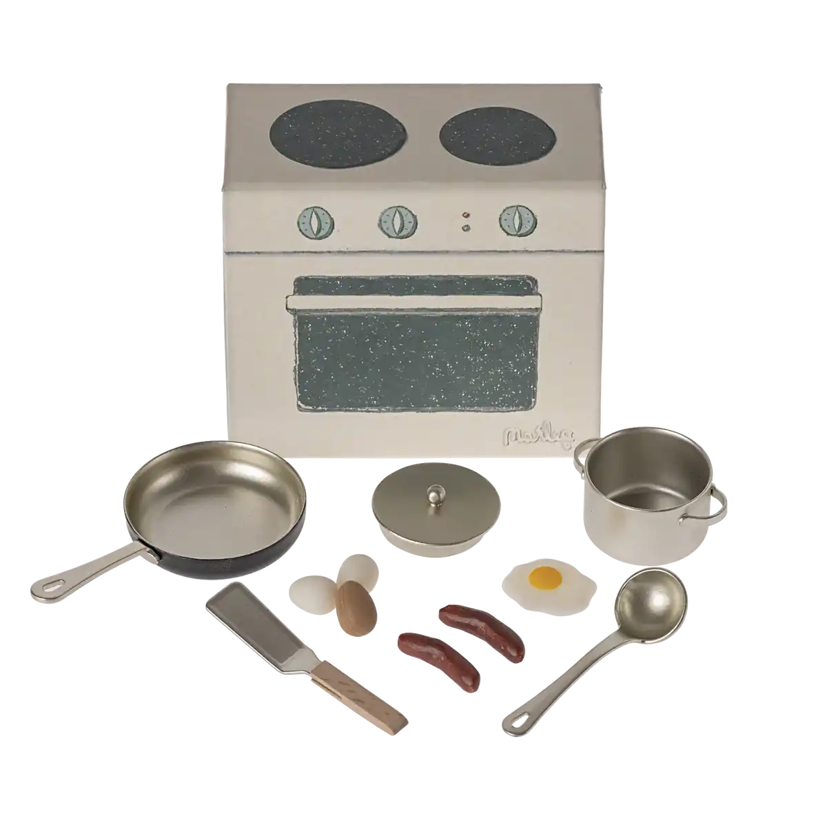 Das liebevoll gestaltete Miniatur-Zubehör hilft dabei, den Alltag der kleinen Mäuschen von Maileg abwechslungsreicher zu gestalten. Dabei achtet Maileg nicht nur auf eine hochwertige Verarbeitung, sondern auch auf viel Liebe zum Detail – in der Ofen-Verpackung von diesem Kochset befinden sich eine Pfanne, ein Topf sowie verschiedene weitere Koch-Utensilien.