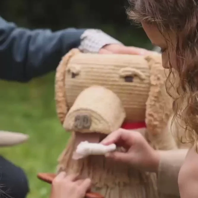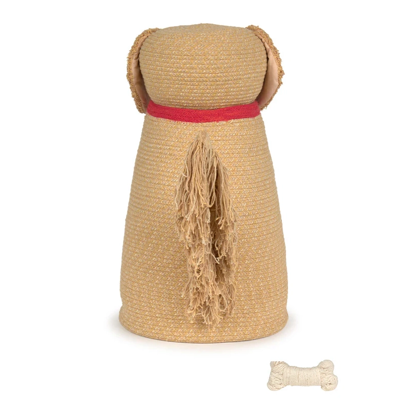 Dies ist der größte handgefertigte Korb in der Lorena Canals Kollektion, inspiriert von der freundlichen Silhouette eines Golden Retrievers. Luna hat viele verspielte Details: mit Stoff ausgekleidete Ohren, handverknotete Augen mit buschigen Augenbrauen, eine interaktive Schnauze mit ausrollbarer Zunge und ein beweglicher Mund. Sie bringt sogar einen kleinen Spielzeugknochen am Etikett und ein rotes Halsband für den letzten herzerwärmenden Touch mit.