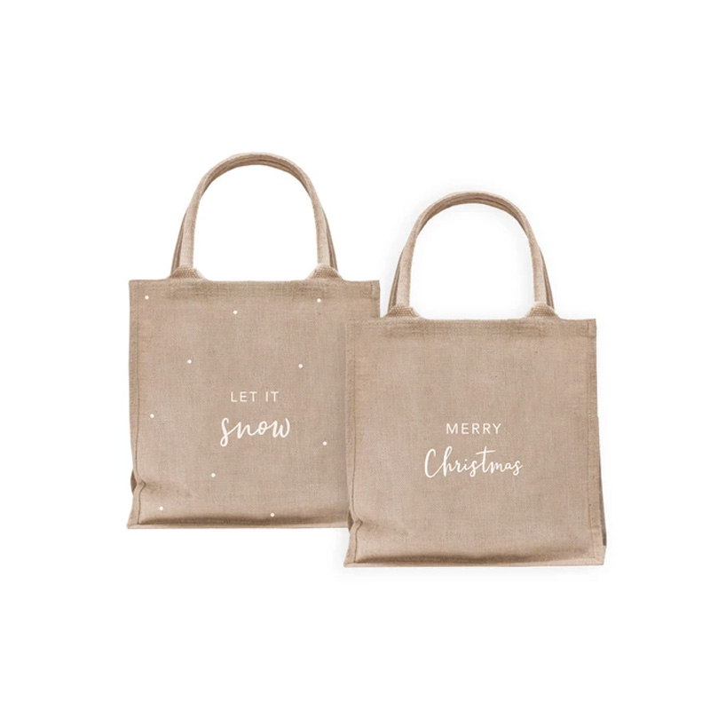 Hochwertige Geschenk-Tüten im Zweier-Set von Eulenschnitt: Wer kleinere Präsente nachhaltig verpacken möchte, bekommt mit diesen Mini-Jutetaschen eine hübsche Alternative. Die weihnachtlichen Sprüche auf der Vorderseite sind die besonderen Hingucker der Naturprodukte.