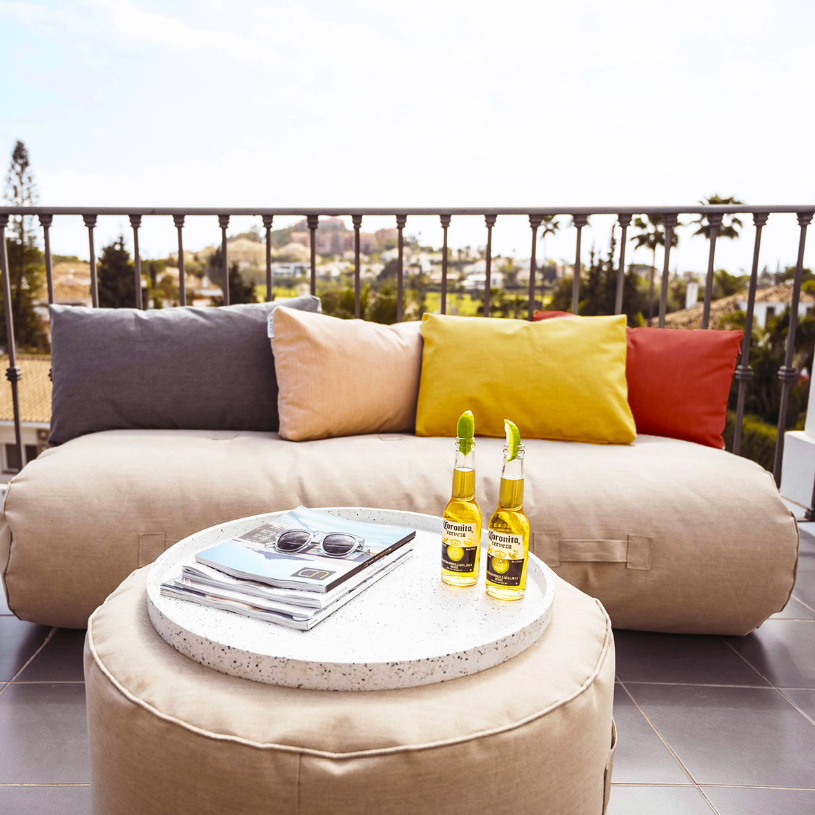 • Set beinhaltet: 1 x Rocket Daybed (180 × 70 × 40 cm), 2 x Lounge Satellite (90 × 70 × 86 cm), 1 x Tiny Moon (70 x 40 cm), 1 x Terrazzotablett (Ø 80 cm), 1 x Großes Kissen, 3 x Kleine Kissen