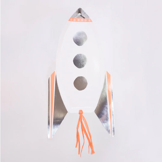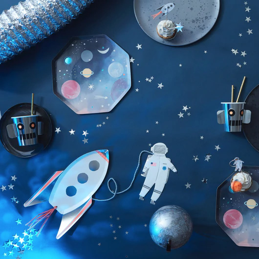 Das Auge isst bekanntlich mit. So wirkt jedes Geburtstagsessen dank dieser stylischen Pappteller von Meri Meri gleich noch viel cooler und schmackhafter! Die in Form einer Rakete gestalteten Partyteller sind mit viel schimmernder Folie verziert und begeistern vor allem angehende Astronauten. 3, 2, 1 … losgegessen!