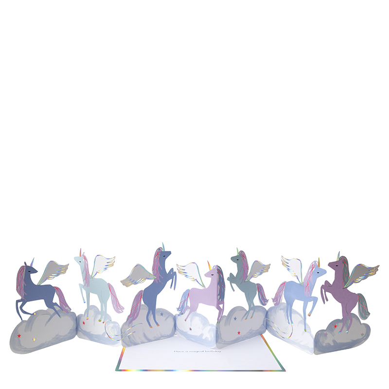 Diese süßen Einhörner stimmen sich mit geübten Tanzschritten bereits auf die Feier ein! Mit den glitzernden und glänzenden Flügeln sind sie auch schon bestens geschmückt, um auf der Party unter den Geburtstagskarten besonders aufzufallen – denn ausgeklappt, können sie von ganz alleine stehen und werden so zur Dekoration.