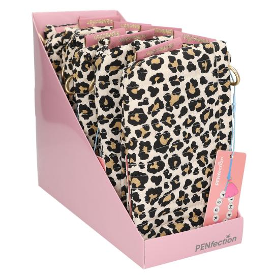 Diese kleine Schlampertasche aus der „PENfection“-Serie von Depesche besteht aus weicher Baumwolle und hat einen stylishen Leo-Print, eine angesagte Steppung, ein niedliches Pünktchen-Muster innen und einen goldenen Reißverschluss mit Ring-Anfasser, an dem Anhänger fixiert werden können. Besonders praktisch: die innere Lasche mit Stifte-Schlaufen, die herausgeklappt werden kann.