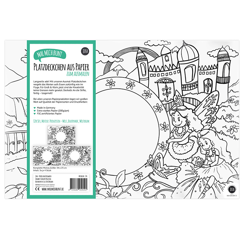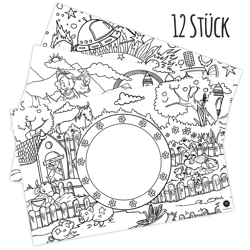 Platzdeckchen „Motiv-Mix I“ zum Ausmalen (Bauernhof, Prinzessin & Weltall)
