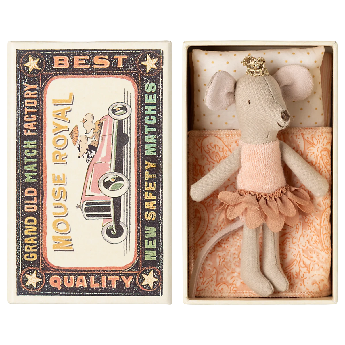 Diese kleine Prinzessin ist bereit für stundenlanges Spielen und schläft fest in einer Streichholzschachtel. Die Kleidung und Bettwäsche der Maus haben einzigartige Drucke und schönen Farben. Die Bettwäsche kann in der Farbe variieren.