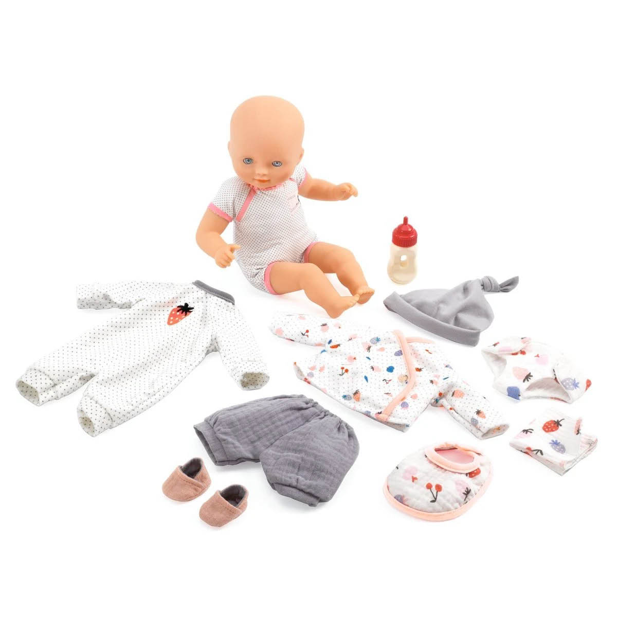 Diese Puppe aus der „Pomea“-Kollektion von DJECO ermöglicht Kindern das authentische Rollenspiel mit Babys: Dank der handlichen Größe ist das Püppchen ideal für kleine Arme geeignet und hat zudem einen extra weichen Körper, der zulässt, dass man es gut positionieren kann. Dazu kommt, dass die Gliedmaßen aus geruchsneutralem Vinyl bestehen, das sich angenehm anfühlt. Legt man die Puppe auf den Rücken, schließt sie ihre Augen zum Schlafen. Dieses Modell ist bereit, auf Reisen zu gehen, und kommt im Koffer mit zahlreichem Zubehör daher, das unterwegs auf keinen Fall fehlen darf – vom Fläschchen über Windel, Schlafanzug und Lätzchen bis hin zu den Schuhen!
