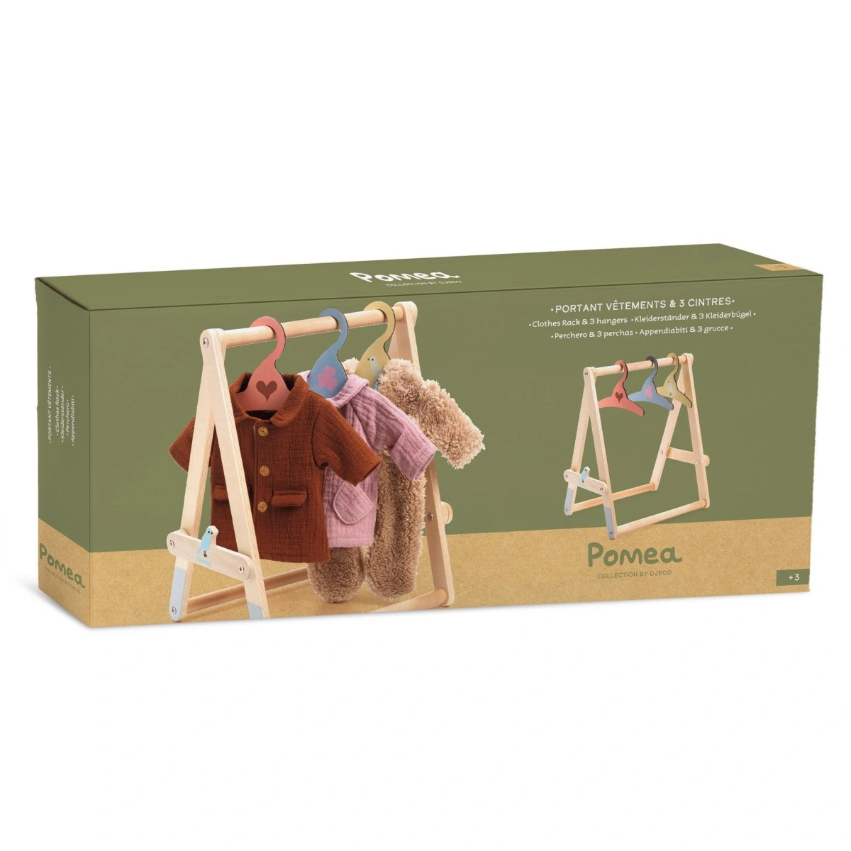 Dieser Kleiderständer aus Holz bietet genügend Platz, um die Kleidersammlung der POMEA Puppen aufzuhängen. Drei Kleiderbügel liegen bei und tragen die süßen Outfits der DJECO Puppen.