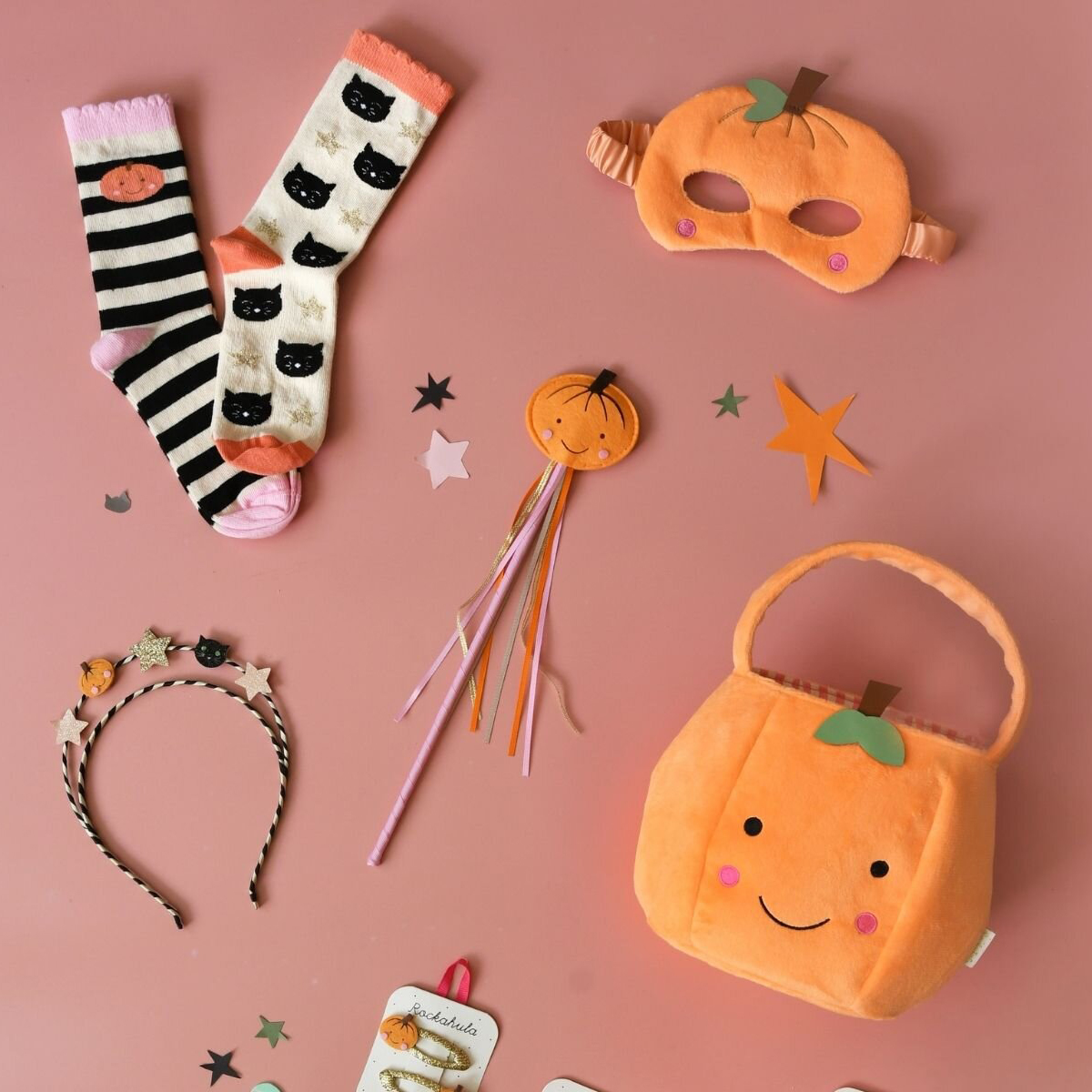 Diese Maske von Rockahula besteht aus weichstem, leuchtend orangefarbenem Samt mit Kürbisdetails und kleinen rosigen Wangen. Die Samtmaske ist mit weichem Satinstoff gefüttert und verfügt über einen Klettverschluss für mehr Sicherheit.