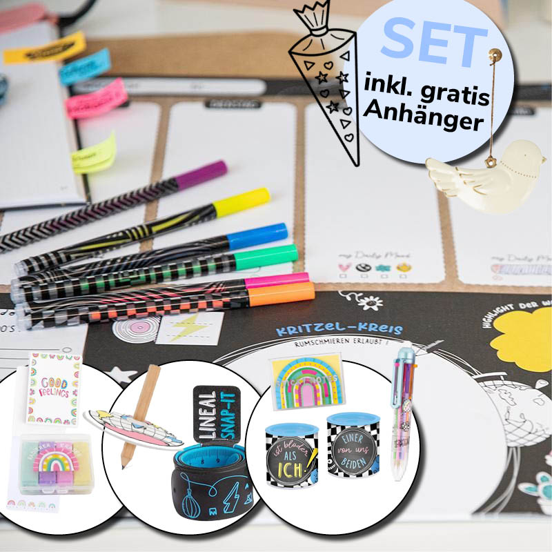 Dieses Set enthält: Touch Merhfarb-Kuli, Motivations-Kuli, Metall-Doppelspitzer „Statement“, Snap-It Lineal (30 cm), Radier-Kreisel, Knet-Radierer „Regenbogen“, Sticky Notes „Good Feelings“ (3-teiliges Set), Mini-Blöckchen „Good Feelings“. Gratis dazu: Metall-Anhänger „Vogel“ von Maileg.