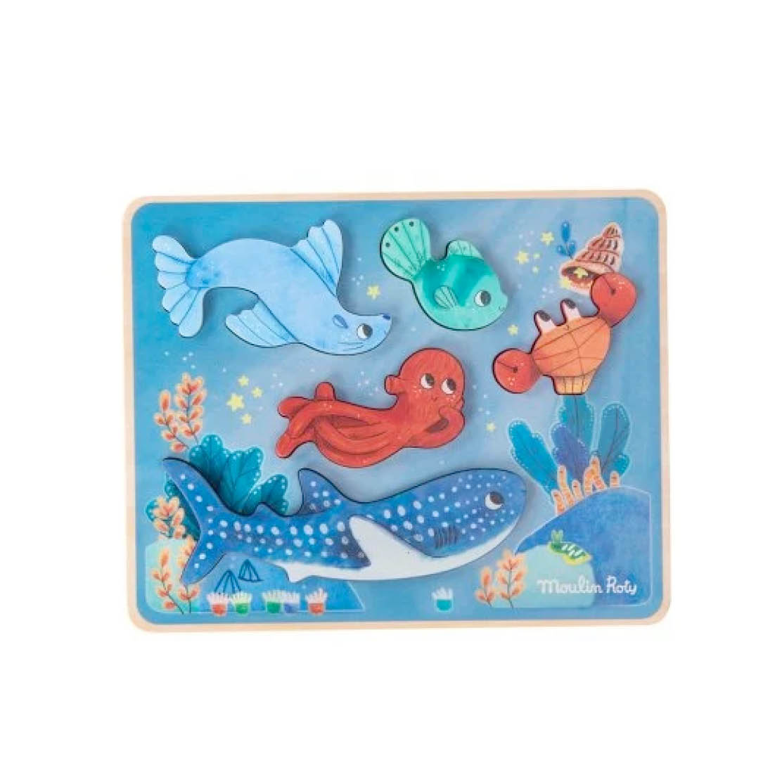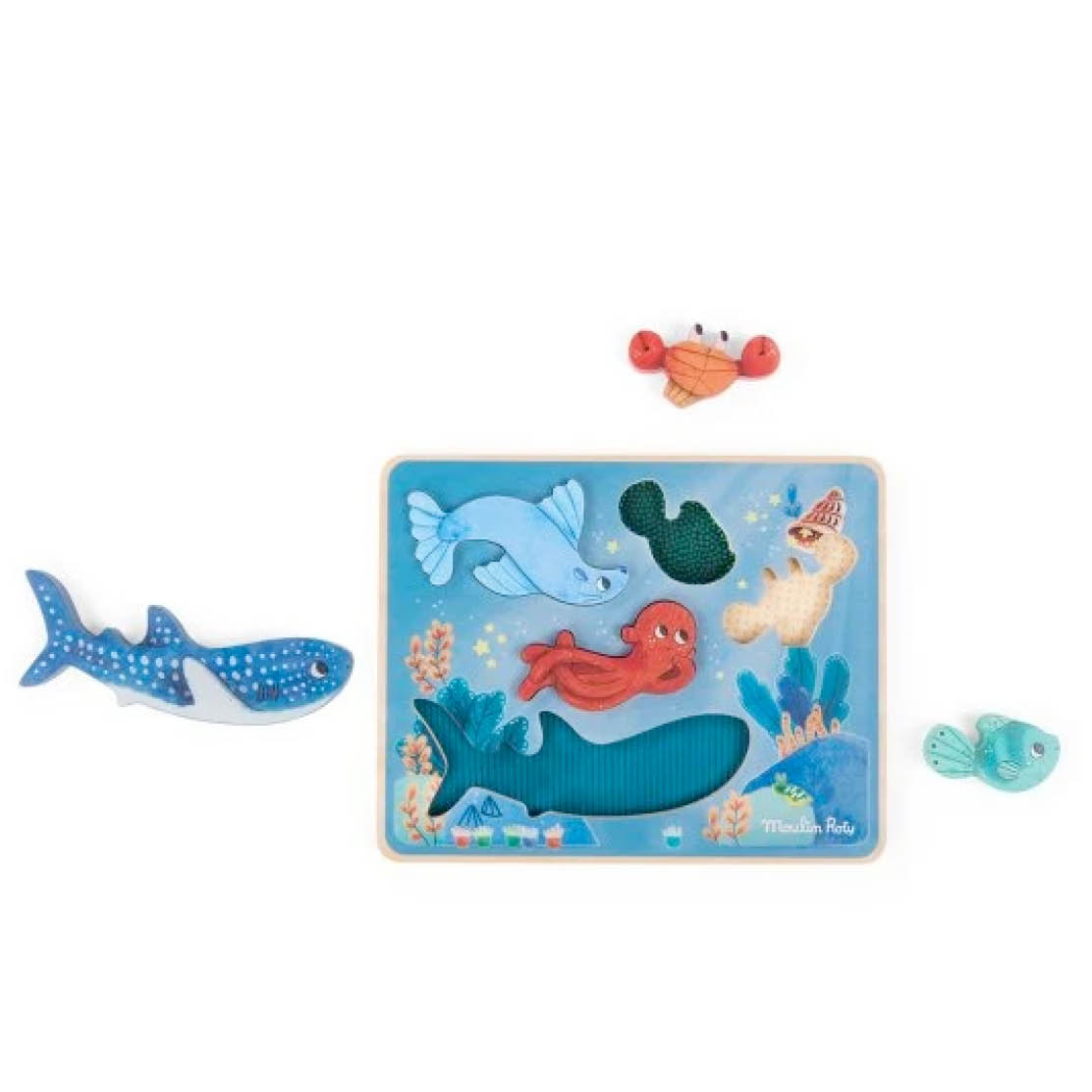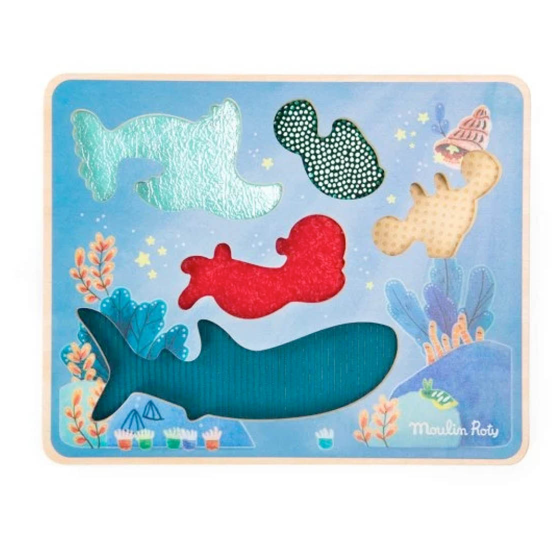 Mit diesem sechsteiligen sensorischen Steckpuzzle entdecken Kinder ab einem Jahr zum ersten Mal Formen, Farben und Texturen! Oktopus Paulie und seine Freunde laden auf eine abenteuerliche Puzzle-Reise unter Wasser ein, auf der man auch einiges über die Bewohner in der Tiefe lernt.