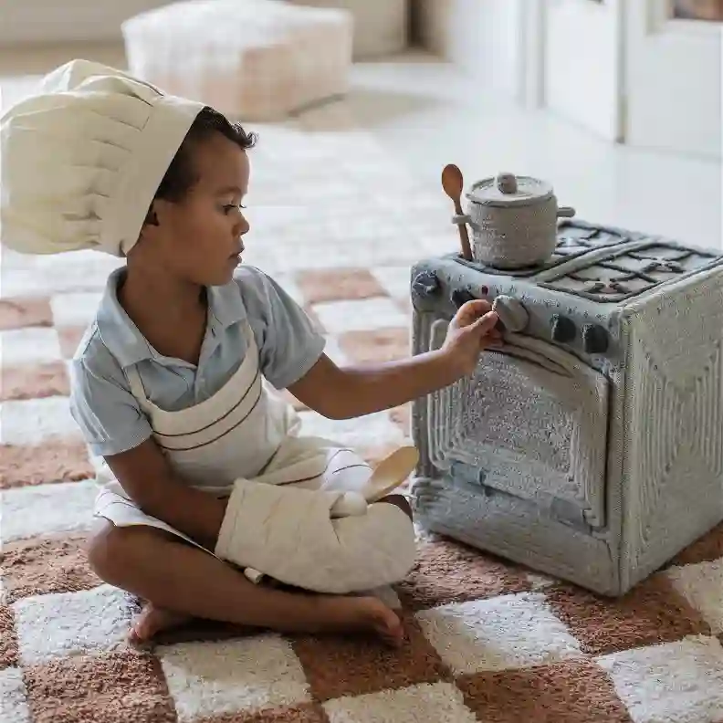 Diese handgefertigte Textilküche mit intigrierten Korb ist ein Muss für all die kleinen Köche! Die angebrachten Knöpfe, die aufklappbare Ofentür und der Gasherd aus schwarzen geflochtenen Baumwollschnüren bringen dabei den richtigen Look. Mitgeliefert wird ein grauer Kochtopf mit Deckel und Kochlöffel. Aber das ist noch nicht alles – der aus PET-Flaschen recycelte Backofen kann auch sehr gut als Aufbewahrungskorb genutzt werden. Er sieht also nicht nur gut aus, sondern ist auch wirklich praktisch.
