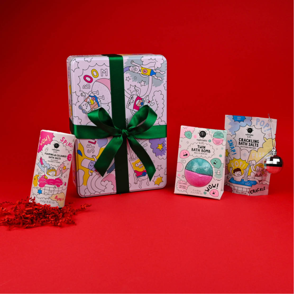Diese Geschenk-Box von Nailmatic Kids ist die perfekte Überraschung für alle kleinen Meerjungfrauen und Wassermänner. In der hübsch designten Metallbox sind 3 spaßige Badeprodukte enthalten, darunter eine Duo-Badebombe in grün und pink für doppelten Planschspaß, ein pinkes Schaum-Badesalz und ein Knisterbadesalz in blau, das durch seine unterhaltsame Geräuschkulisse für jede Menge Freude sorgt.