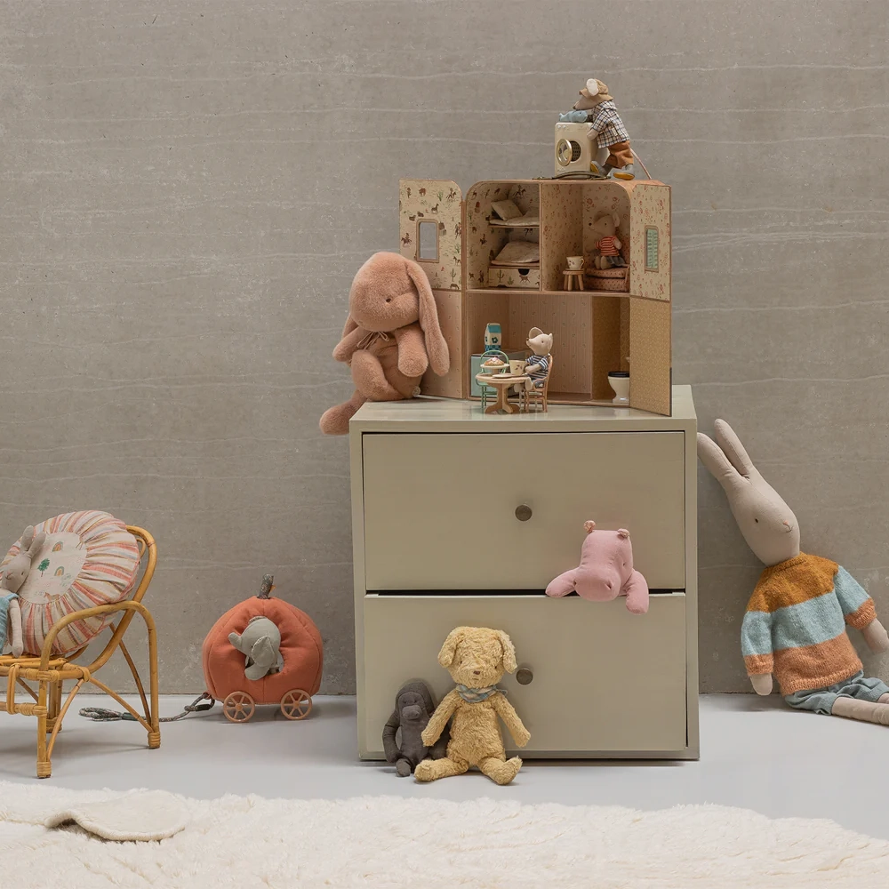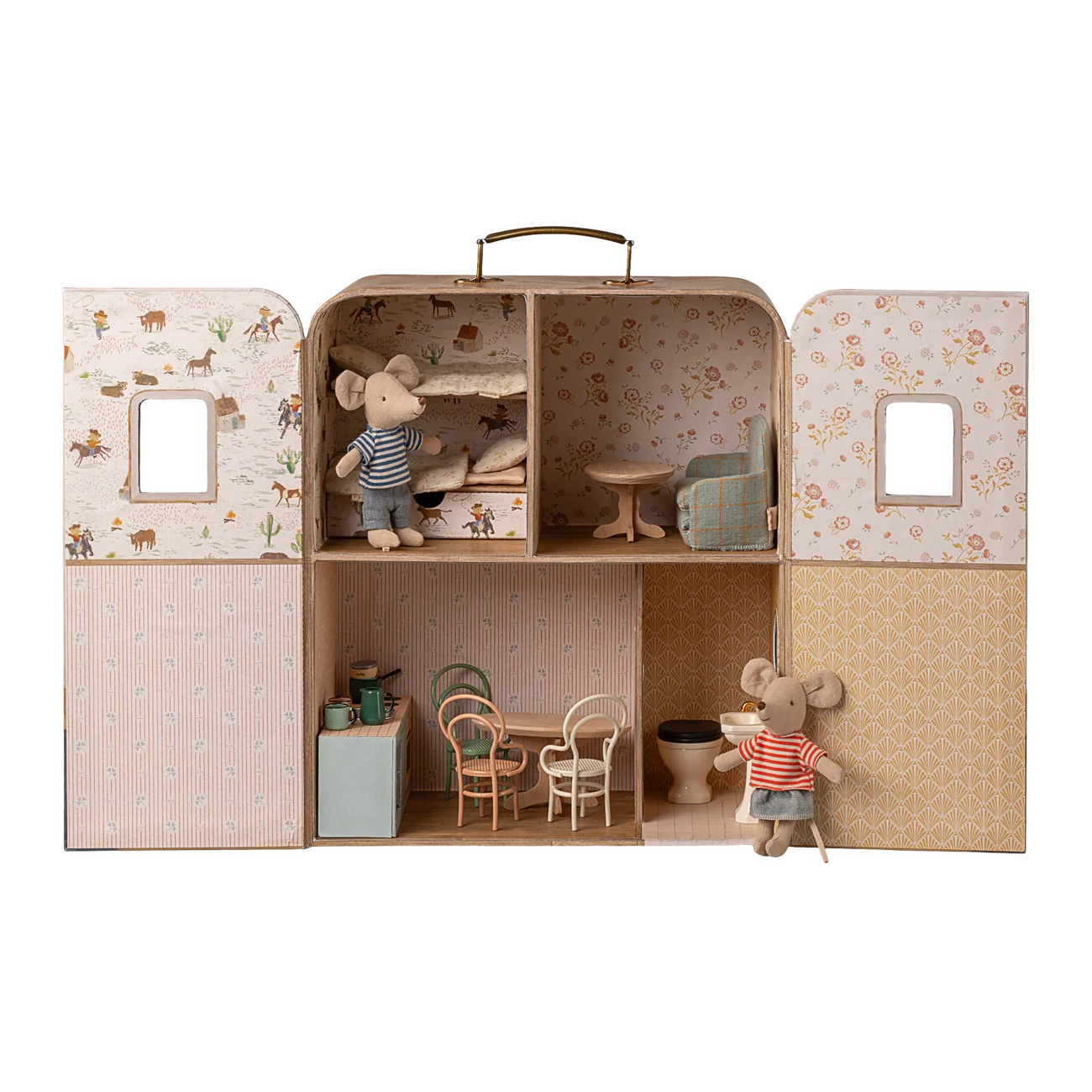 Willkommen im SuitCasa – ein kleines tragbares Haus, in dem die kleinen Geschwister der Maileg-Familie ihren ganz eigenen Rückzugsort finden. Die Raumeinteilung in Schlafzimmer, Wohnzimmer, Küche und Bad ist geschickt umgesetzt und lässt sich mit zahlreichem Zubehör aufpeppen. Im Lieferumfang enthalten sind zwei Sets Bettwäsche als „Einzugsgeschenk“!