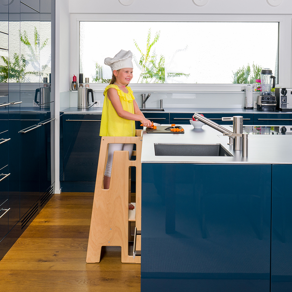 Der im Schweizer Design gehaltene Tuki Lernturm ermöglicht es Kleinkindern, an der „Erwachsenenwelt“ teilzunehmen. Ob nun in der Küche beim Kochen, am Esstisch, in der Werkstatt beim Basteln oder im Badezimmer beim Händewaschen und Zähneputzen. Orte, die vorher noch unerreichbar waren, werden so auch für die Kleinsten zugänglich. Auf diese Weise können Kinder die Welt auf eigene Faust entdecken! Der Lernturm ist höhenverstellbar, hält ein Gewicht von bis zu 50 kg aus und ist in verschiedenen Farben erhältlich.