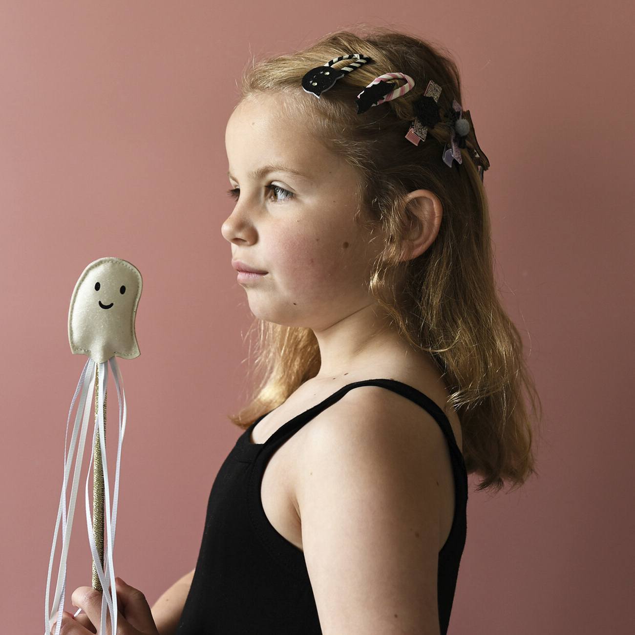 Jetzt wird es magisch: Mit diesem Zauberstab von Rockahula ist man Halloween bestens gerüstet! Er besteht aus glitzerndem weißen Stoff mit hübschen pastellfarbenen Grosgrain-Band-Wimpeln. Der Hingucker ist natürlich der freundliche Geist am oberen Ende.