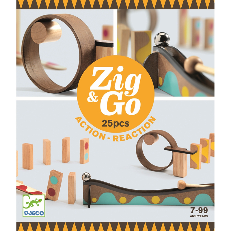 „Zig & Go“ von DJECO steht für ein spaßiges Aktion-Reaktion-Spieleerlebnis. Der Baukasten ermöglicht es, einen Parcours nach einer der mitgelieferten Vorlagen zu bauen oder auch ein ganz eigenes Modell zu entwerfen. Es gibt viele Möglichkeiten, die Bauteile zu platzieren und am Ende eine riesige Kettenreaktion auszulösen. Dabei ist Geschicklichkeit gefragt. Noch raffinierter wird der Parcours, wenn man ihn mit Bestandteilen anderer „Zig & Go“-Baukästen der Kollektion kombiniert.