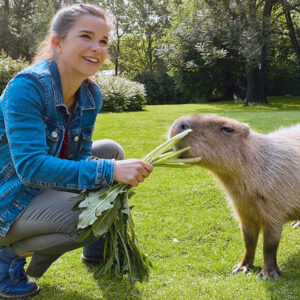 Kindersendung Ohne Freundschaften ist das Leben nur halb so schön! Aber gibt es die auch im Tierreich? Im Tierpark Hellabrunn bewaffnet sich Anna (Foto) mit vielen Salatblättern und kommt mit Tierpfleger Florian ganz nah an Wasserschwein Tracy ran. Die Wasserschweindame wohnt in der Südamerika-Anlage mit Nasenbär Xippe, Pampas-Hasen und Vikunjas – einer kleinen Kamelart. Doch Freunde sind die unterschiedlichen Tierarten nicht, sagt Florian. Denn in freier Wildbahn wären sich die Tiere völlig egal. Hier im Tierpark leben sie nur in einer Zweckgemeinschaft zusammen.
